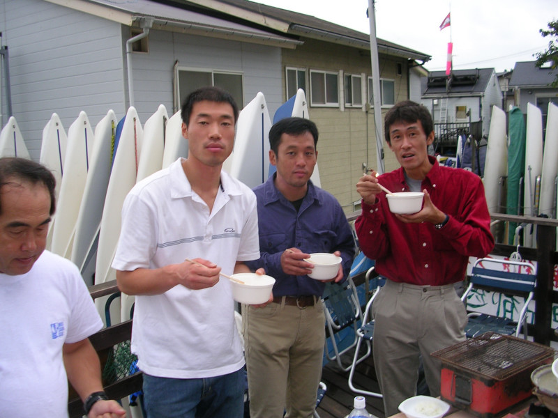 鎌倉につくとヤハリ雨。しかしフリートハウスにつくと元気に船をだす草分氏を目撃。置き場深くに入ると橋本さんや姉妹、ユマやヤマちゃんBM・カニさんにコウタにエリサや山下さんなどなどがすでに活動中。マジ??と思いながら、船を出し始めると大粒の雨がお空より降ってきました。